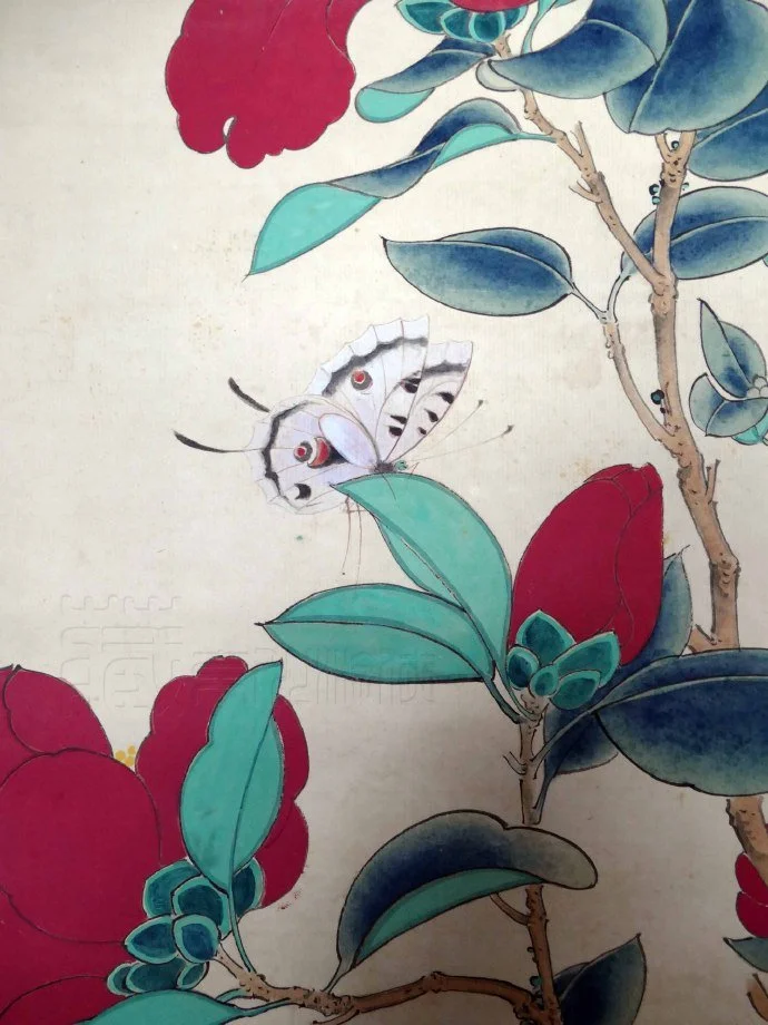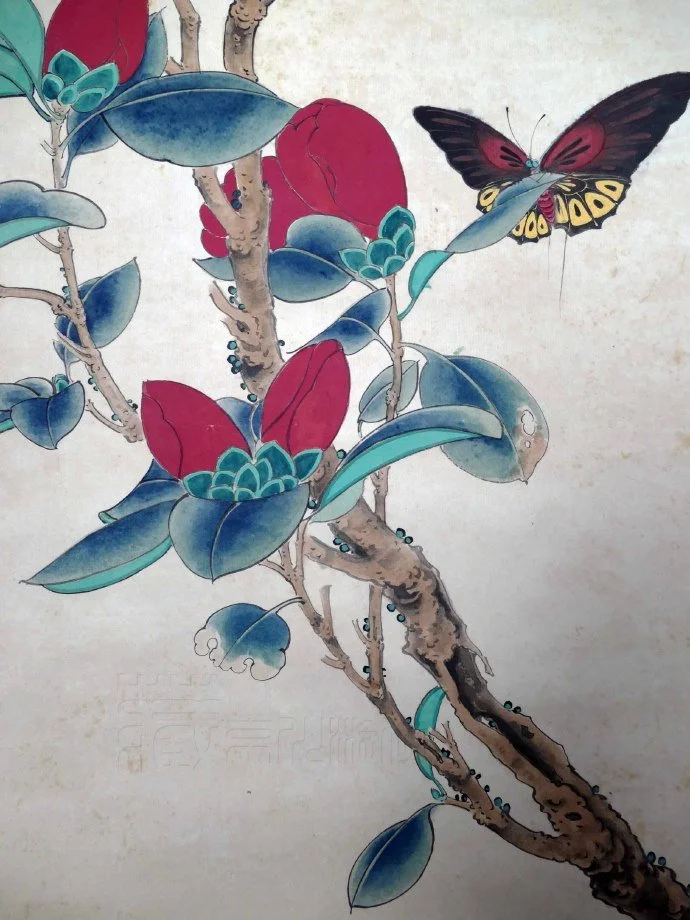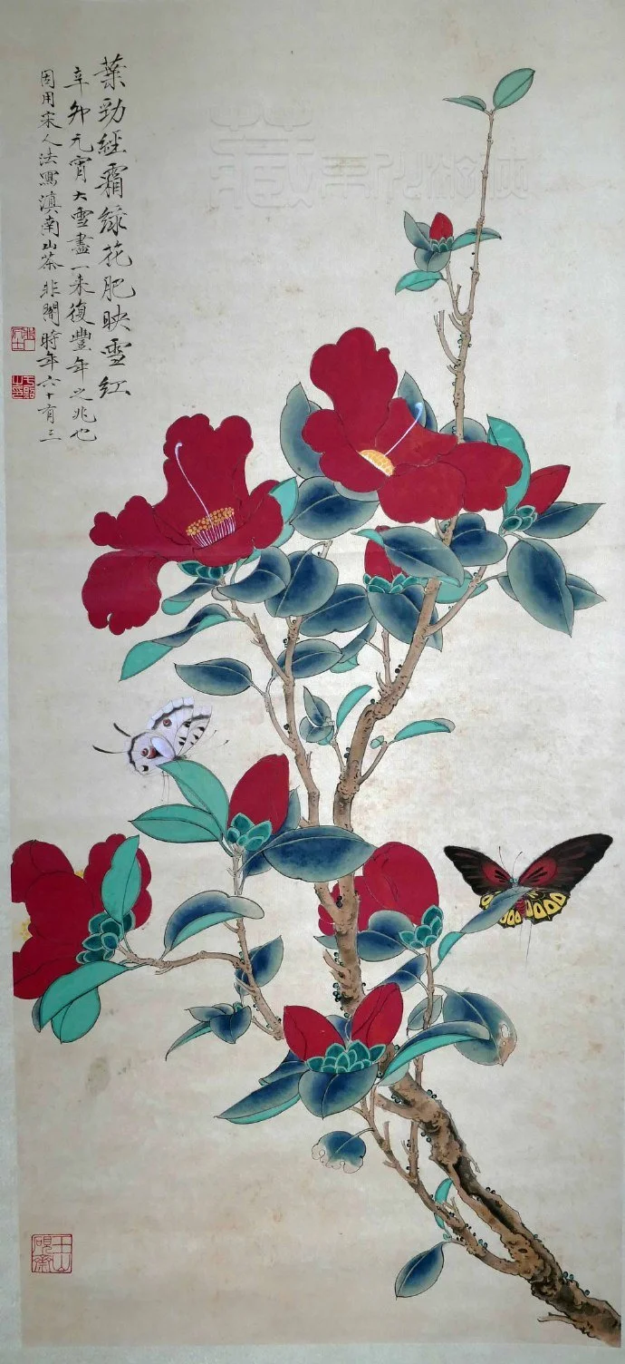鉴赏此画。正如其题跋所书,其画主体乃滇南山茶花,辅之以双彩蝴蝶。图中山茶花盛开,树干老迈遒劲,枝叶刚劲,花朵柔媚,浓淡相间,深浅协调,正是艳而不俗,仿宋双钩笔意,一流工笔之功力展露无遗。而山茶花枝,一浓一淡两只彩蝶翻飞,更是增添了画之动感,灵气十足。