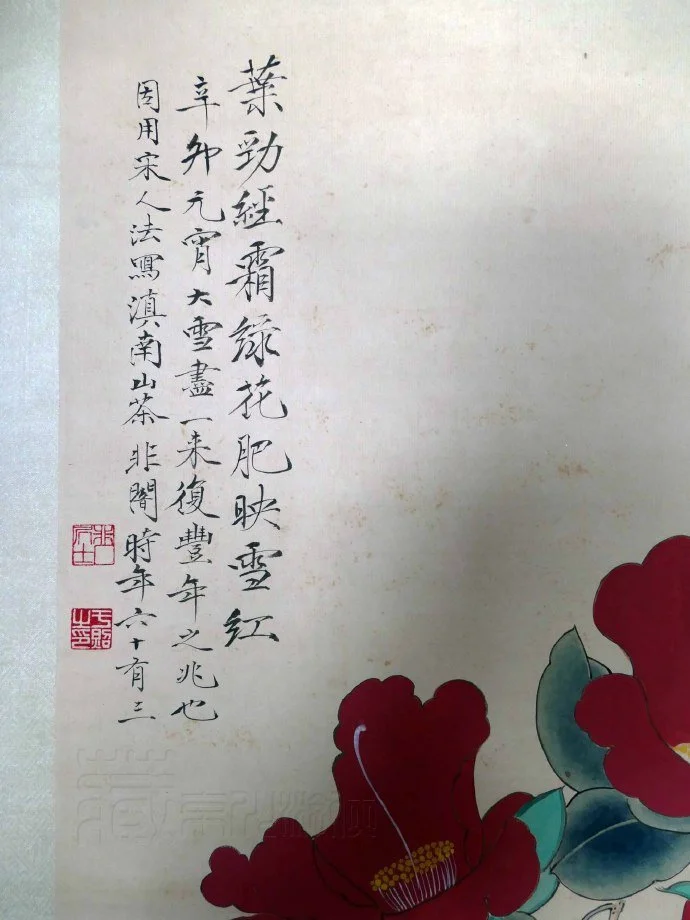 续观题跋,左上隽美而刚劲的瘦金书,题“叶劲经霜绿,花肥映雪红”,再题辛卯年元宵,显示此画画于1951年,其时正是其六十三岁所作。且注明用宋人笔法写云南山茶花。钤印三方,朱文“非厂居士”、“玉山砚斋”、白文“于照之印”,皆真实无疑。