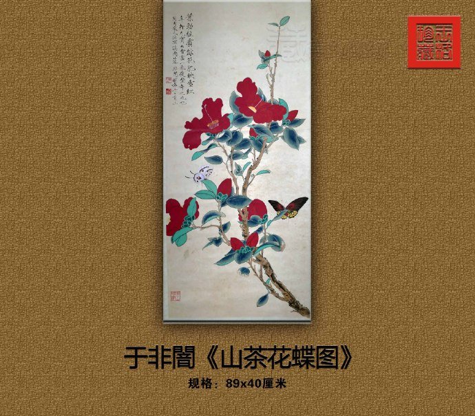今日赏画,是愚帐中所藏一幅于非闇的山茶花蝶图,乃其晚年作品之一,未见披露。藉此,特将其帐中择出,拍照亮相,遣之于此公展鉴赏,一睹先生之精妙彩笔,以飨藏好。