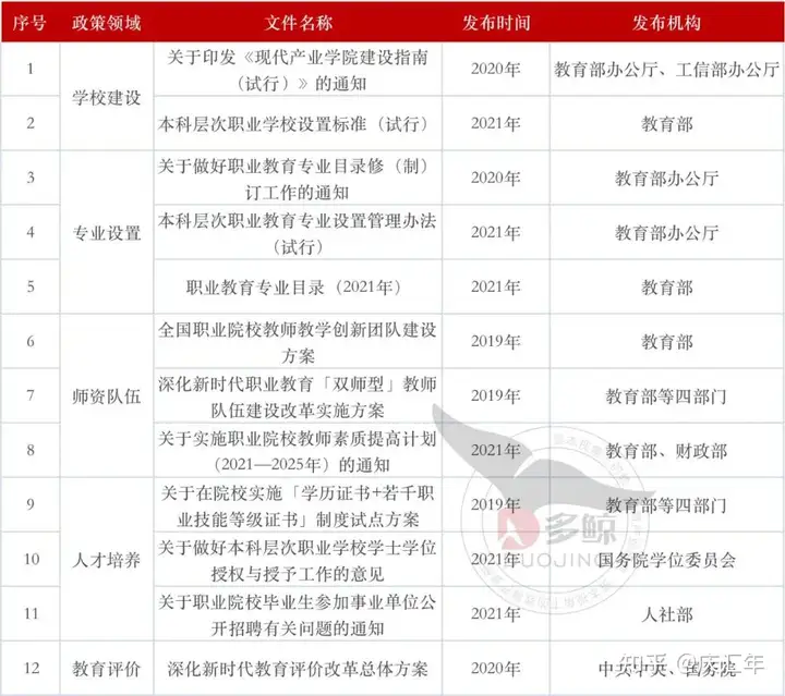 可以看出,在稳步发展职业本科教育的总基调下,政策供给力度持续加大。尤其 2019 年开展本科层次职业教育试点以来,国家密集出台了一系列政策,在学校建设、专业设置、师资队伍、人才培养、教育评价等方面给予指导和支持。