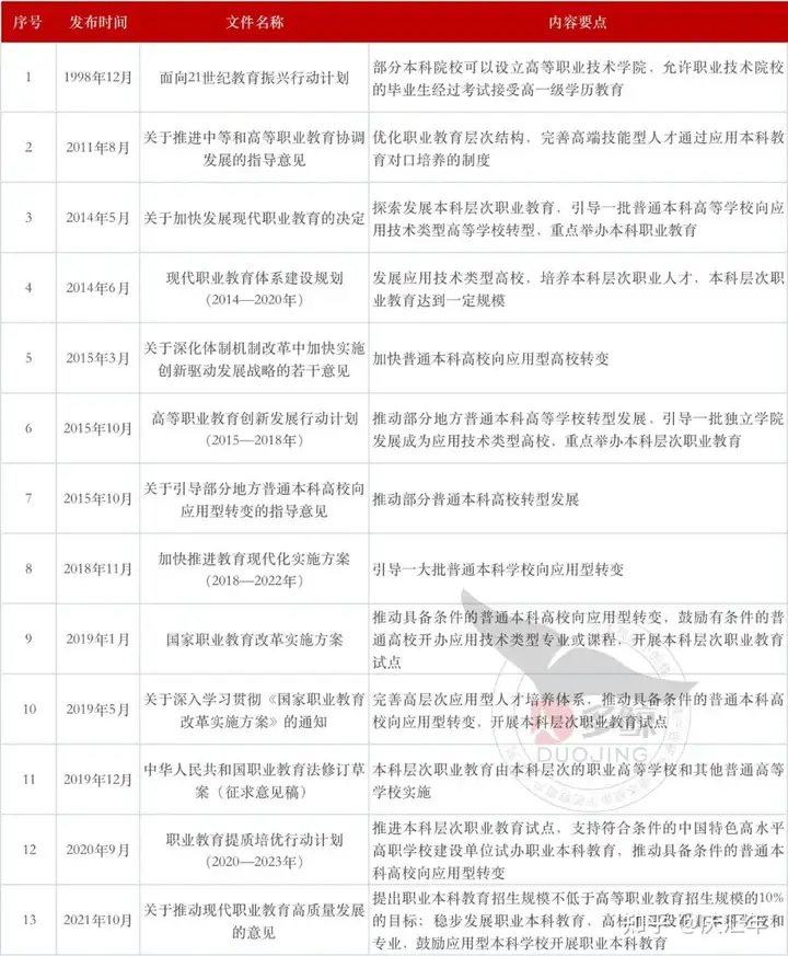 2014 年以前,我国仅有两部政策提及本科层次技术技能人才培养,明确了应用型本科教育属于职业教育体系中的本科层次,专科层次职业院校学生可以通过「专升本」考试获得本科学历教育,主要通过「试办」和「联办」的形式探索培养本科层次技术技能人才。
