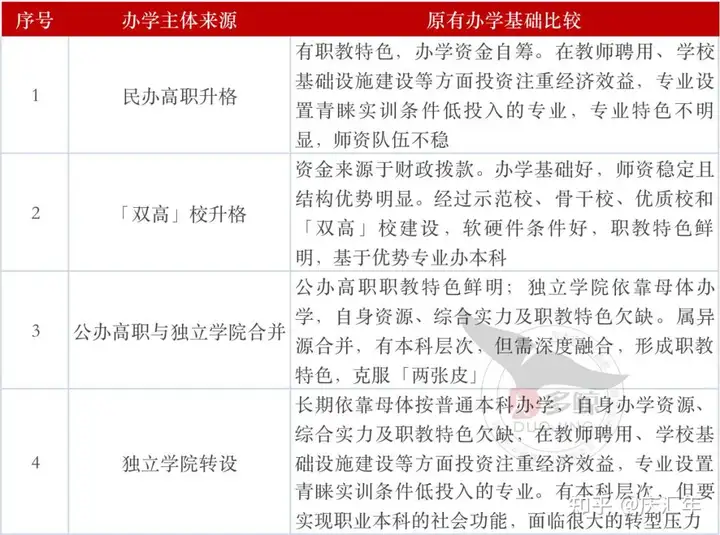 一是将有大量的民办高职院校、公办高职及独立学校等发展为职业本科学校,增加学校总量。现阶段中国职业本科办学主体有着不同来源。一是民办高职本身拥有职教特色,有升格为职业本科教育的潜力;二是「双高」校办学基础好,师资稳定且结构优势明显,同样也有升格为职业本科教育的潜力;三是公办高职与独立学校合并,两者特色明显,也容易形成职教特色;四是由独立学校转设,不过职教特色不明显,可作为升格职业本科的后备军。