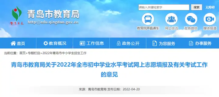 青岛市教育局关于2022年全市初中学业水平考试网上志愿填报及有关考试工作的意见