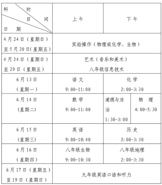 艺术、实验操作(物理或化学、生物)、信息技术考试由各区市教体局在市局统一规定的时间内安排,由各初中学校自行组织实施。