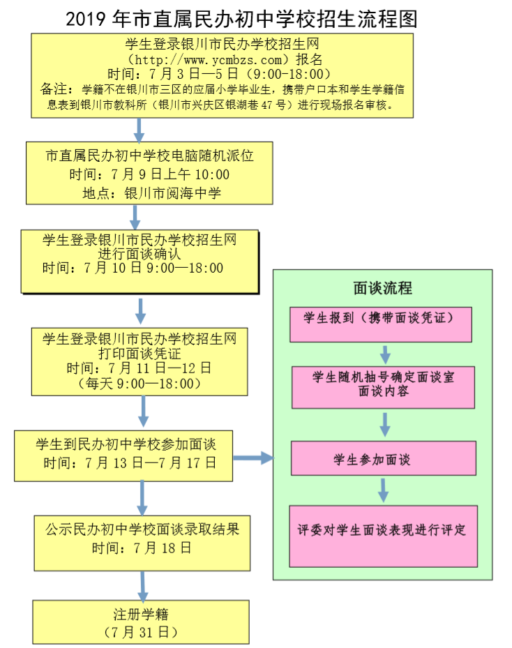 为了方便学生和家长报名,避免频繁到现场确认的不便,充分利用互联网技术,学生面谈确认及打印面谈凭证全部实现网络自动化。凡已报名成功但未被电脑派位录取,且愿意参加面谈的学生,必须于7月10日9:00—18:00期间登录银川市民办学校招生网进行面谈确认。学生面谈确认后由系统对已确认的学生编排面谈时间。学生于7月11日 9:00至 7月 12日 18:00登录银川市民办学校招生网下载打印面谈凭证,凭证中注明学生参加面谈的时间和场次。面谈凭证是学生参加面谈的唯一证明,无面谈凭证的学生不得参加面谈,不予注册学籍。