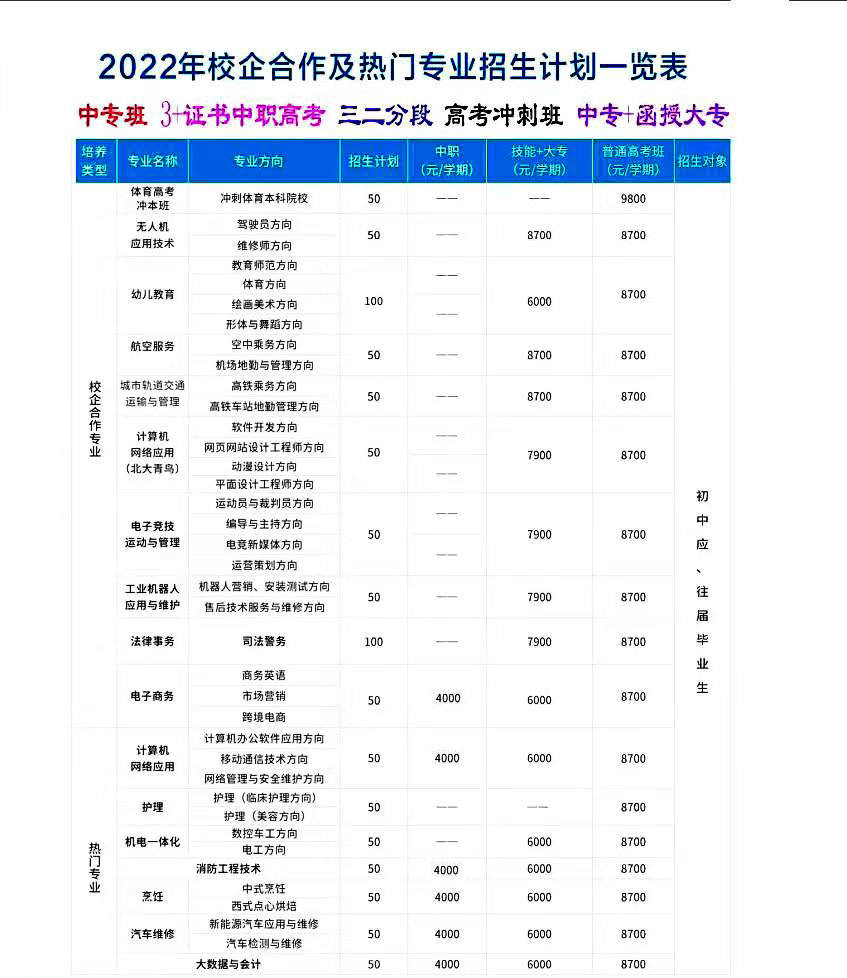 中技专业连读班开设的专业有:无人机应用技术(驾驶员方向、维修师方向)、幼儿教育(教育师范方向、美术绘画方向、形体与舞蹈方向)、航空服务(空中乘务方向、机场地勤与管理方向)、城市轨道交通运输与管理(高铁乘务方向、高铁车站地勤管理方向)、计算机网络应用北大青鸟(软件开发方向、网页网站设计工程师方向、动漫设计方向、平面设计工程师方向)、电子竞技运动与管理(运动员与裁判员方向、编导与主持方向、电竞新媒体方向、运营策划方向)、工业机器人应用与维护(机器人营销、安装测试方向、售后技术服务与维修方向)、法律事务、电子商务(商务英语方向、市场营销方向、跨境电商方向)、计算机网络应用(计算机办公软件应用方向、移动通信技术方向、网络管理与安全·维护方向)、机电一体化(数控车工方向、电工方向)、消防工程技术、烹饪(中式烹饪方向、西式点心烘培方向)、汽车维修(新能源汽车应用与维修方向、汽车检测与维修方向)、会计