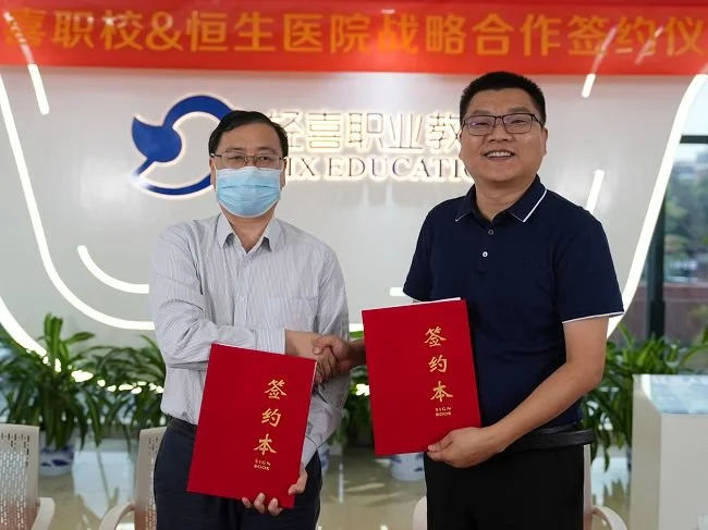 图为轻喜职校校长翟继宝(右)与恒生医院院长吴翔(左)签署战略合作协议