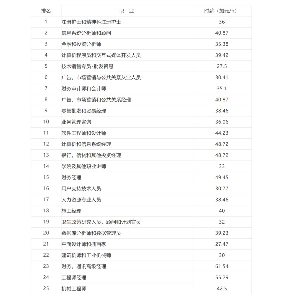 而工资最高的是商务和通讯等行业的高级经理,每小时可以赚61.54加元。