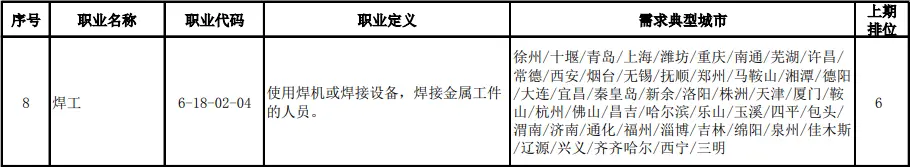 2020年7月21日,在人社部发布2020年第二季度全国招聘求职100个短缺职业中,焊工高居第8。值得一提的是,“焊工电工”已经连续三期入选,“焊工”更是连续高居短缺行业排名前几名!