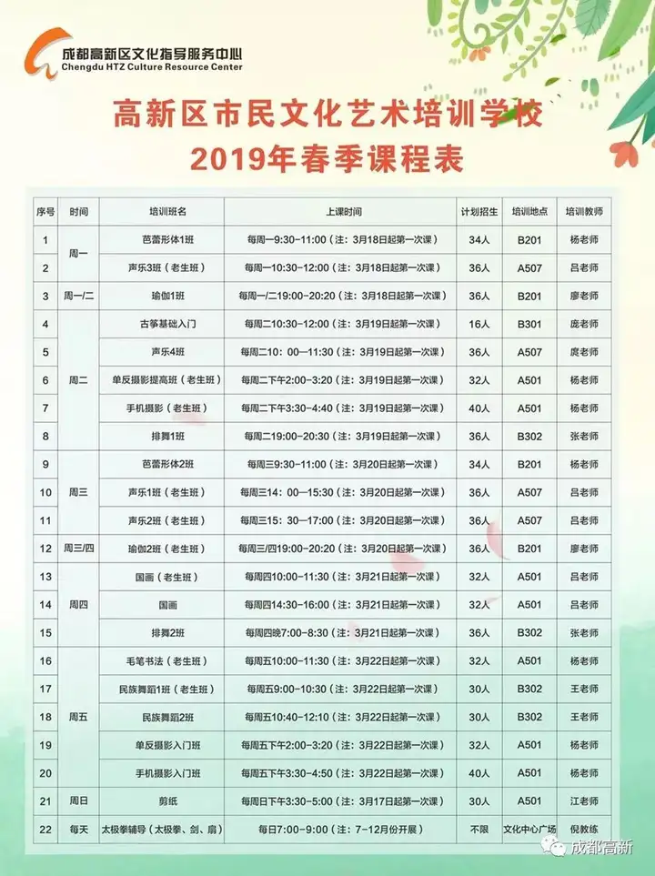 ● 请广大市民朋友报名前仔细阅读《高新区市民文化艺术培训学校2019年春季班课表》,根据您自己的兴趣爱好、身体状况和时间认真考虑。对于一些有剧烈运动的课程,请您务必谨慎参与。