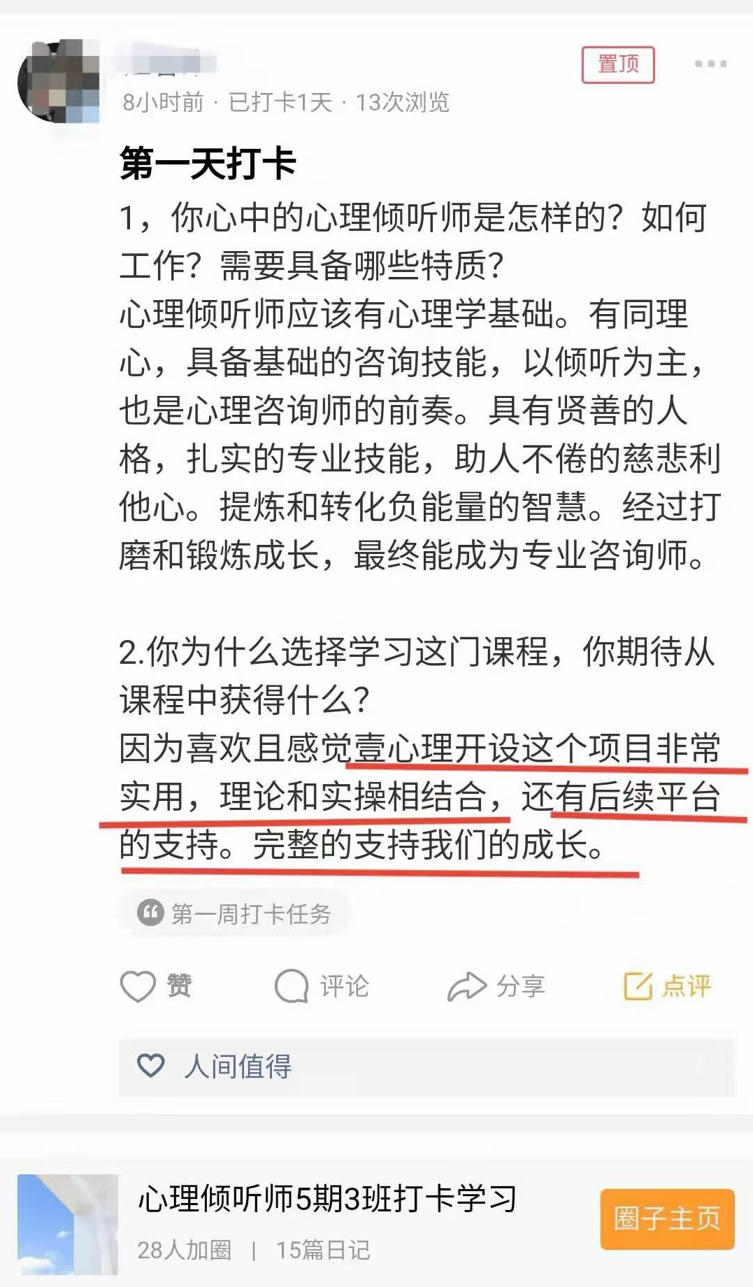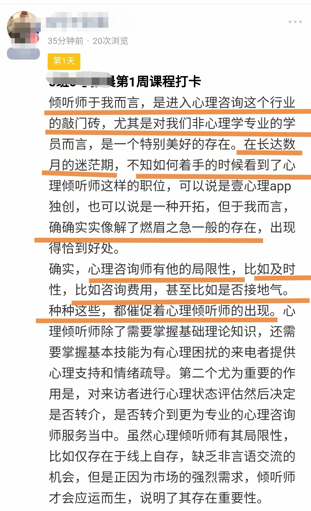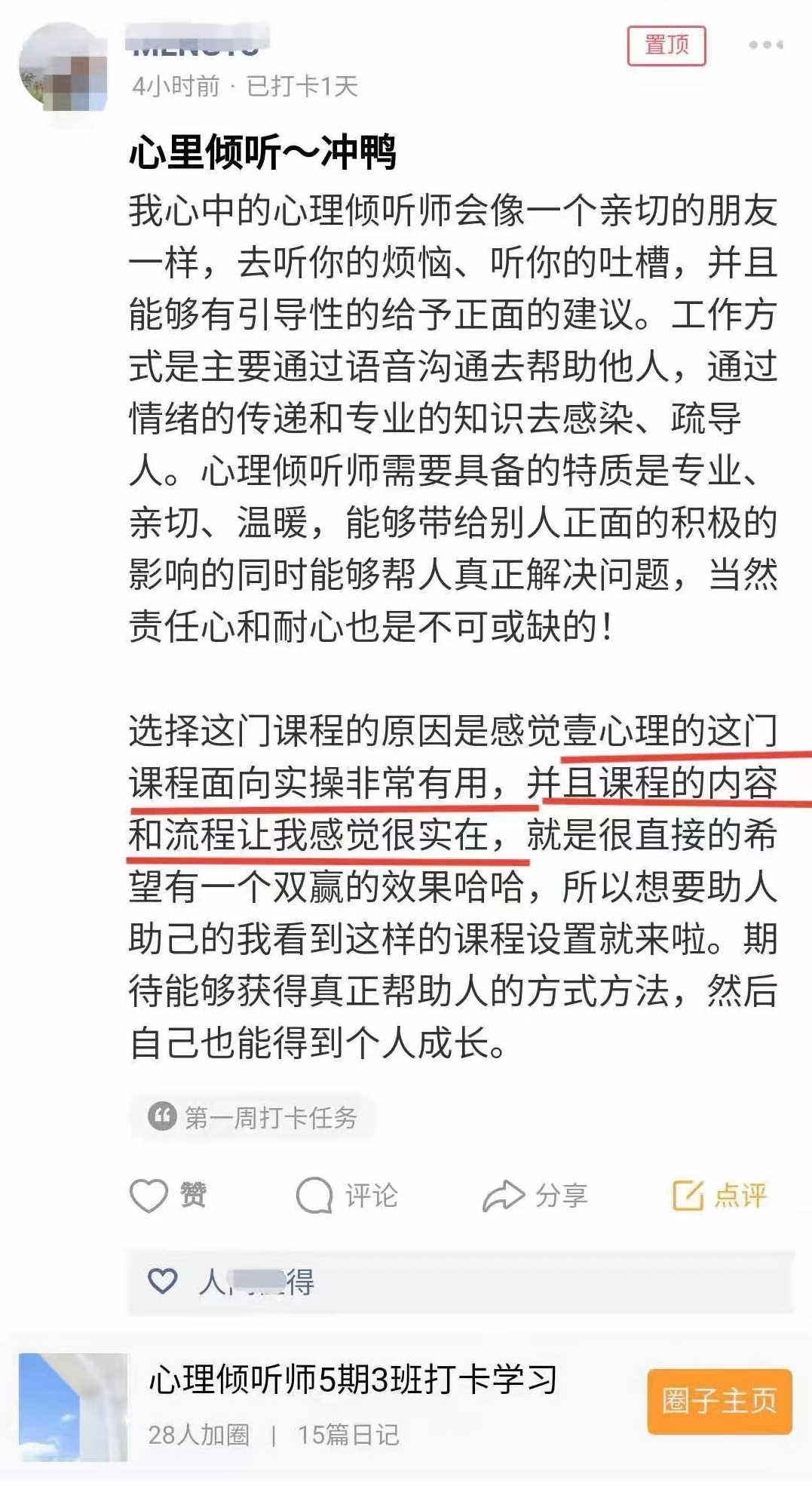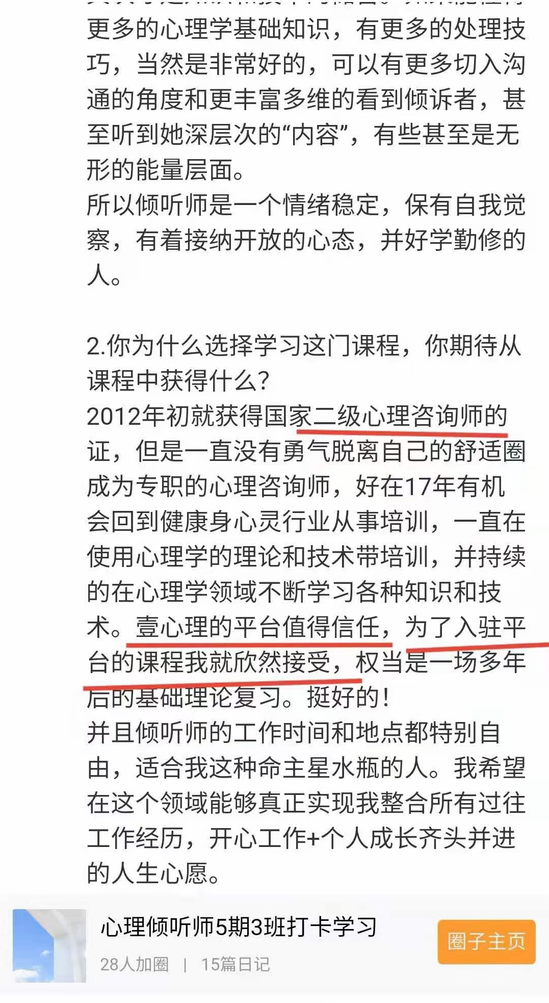 于是她开始尝试收集入门心理学行业的资料,深度了解一番后,她选择了成为她开始搜集入门心理学行业的资料,经历一番深度了解之后,选择了专业门槛限制不高的倾听师作为入门。