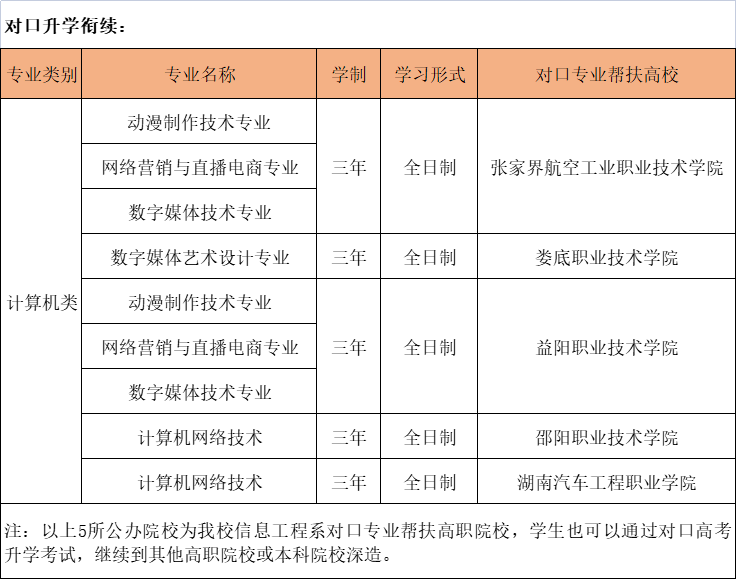 为了贯彻落实《关于推动现代职业教育高质量发展的意见》文件精神,满足社会在职业教育和人才培养上的需求,我校信息工程系与张家界航空工业职业技术学校、娄底职业技术学校、益阳职业技术学校、邵阳职业技术学校、湖南汽车工程职业技术学校建立对口帮扶合作共建关系,通过高中职帮扶、优势互补,在师资建设、人才培养、就业平台和专业实训设施上实现资源共享,达到相互促进、共同发展的目的。