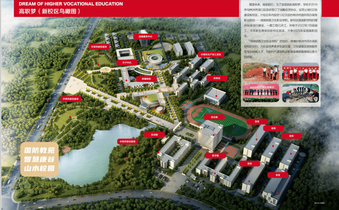 新校区位靠南洲大道(驾考中心对面),规划建有教学楼、学生公寓、学生食堂、运动场、国际教育中心、技能培训中心(包括轨道交通人才培训基地、高端护理人才培训基地及新媒体营销人才培训基地)、实训中心及产业孵化园(包括新媒体营销中心、妈妈养生馆、康养中心)等。