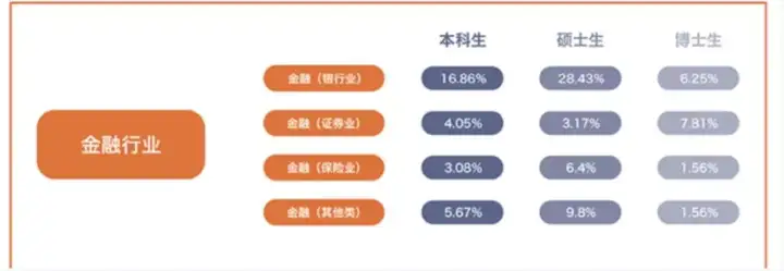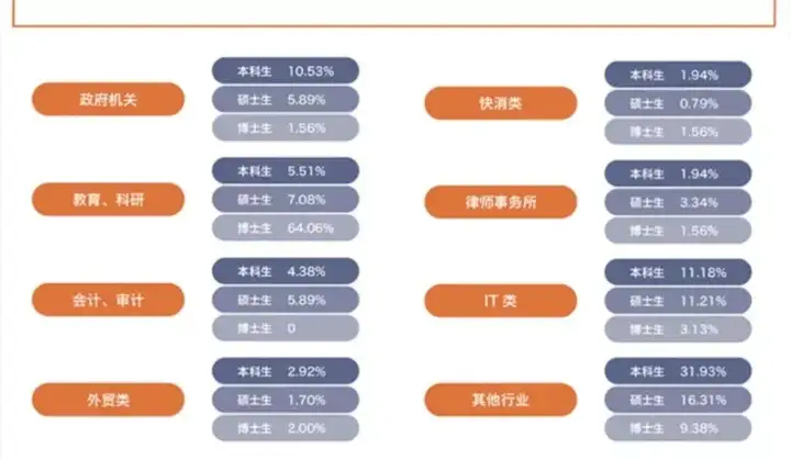 上海财经大学毕业生的就业中,金融大类以41.32%的比例居于首位,会计师事务所9.09%、教育科研9.04%位居第二、第三。金融大类内部、银行仍位居首位,占到金融行业就业人数比例的47.38%。