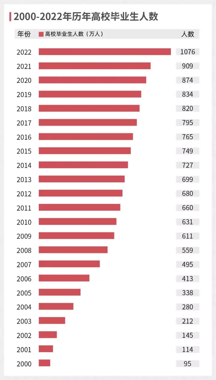 根据教育部今年的最新统计,2022年中国高校毕业生超过了1076万人。