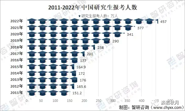 让我们再来看看另一个卷学历的现象:从我国硕士研究生报考人数来看,自2016年起,我国硕士研究生报考人数一直在增长。2022年全国硕士研究生报名人数457万,较上年增长80万.。