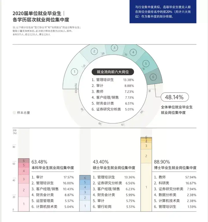 就业流向岗位主要是管理培训生、审计、教师、客户经理/销售、财务会计类、证券研究分析类等6大岗位。
