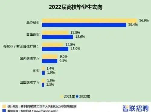 近日智联招聘平台发布《2022大学生就业力调研报告》,2022届高校毕业生仅50.4%选择单位就业,比2021年下降6%,详情可以见下图。