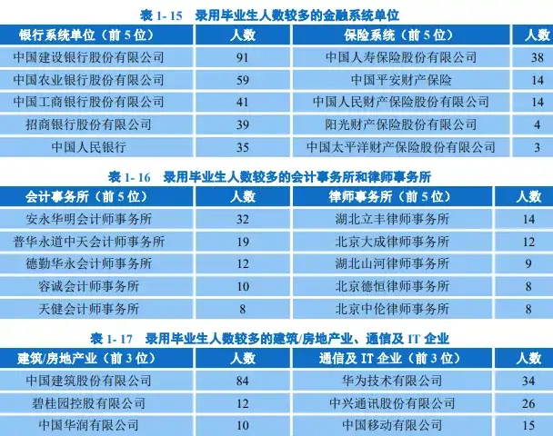 中南财经政法大学毕业生主要签约金融系统单位为:中国建设银行,中国农业银行,中国工商银行,招商银行,人民银行等。