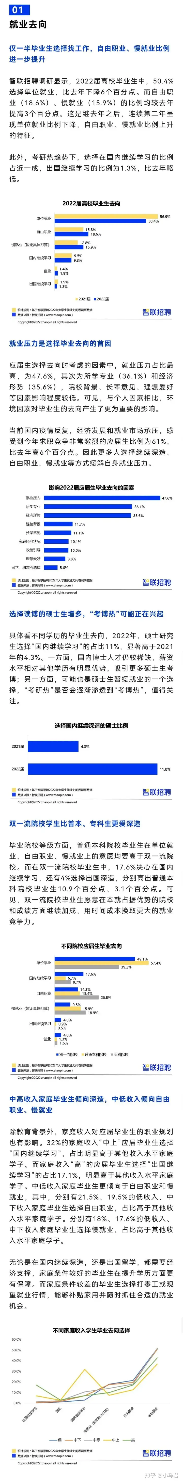 仅一半毕业生选择单位就业,自由职业、慢就业比例进一步提升就业压力是选择毕业去向的首因选择读博的硕士生增多,“考博热”可能正在兴起双一流院校学生比普本、专科生更爱深造就业期待