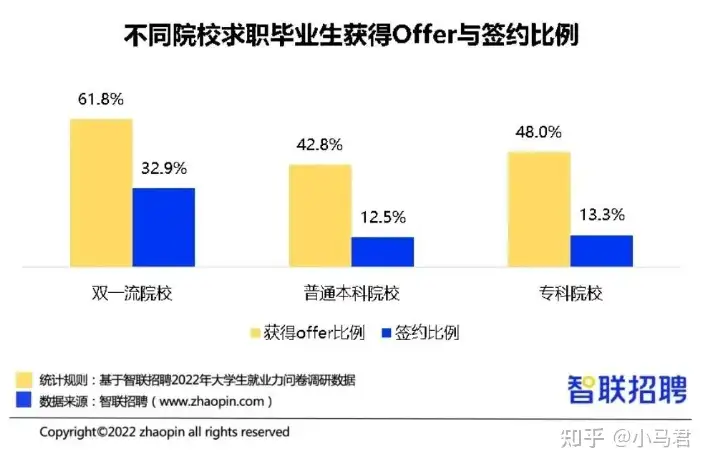 截至 4 月中旬,46.7% 求职毕业生获得 Offer,15.4% 已签约国家机关、事业单位对大学生就业吸纳作用提升硕士生签约率下降,专科生签约率逆势上升双一流院校就业优势明显,普本毕业生陷就业困境理工科学生签约率领先,经管类签约进展慢2022 届毕业生平均签约月薪 6507 元8 成毕业生签约工作与专业对口名校光环照耀“双一流”求职路,普本、专科生受益于实习经历