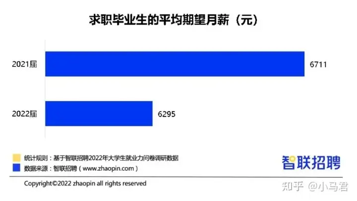 近日,智联招聘发布了《2022大学生就业力调研报告》,2022届毕业生求稳心态有增无减,平均期望月薪 6295 元,相比去年的 6711 元下降了约 6%,对月薪的期望值普遍下降。