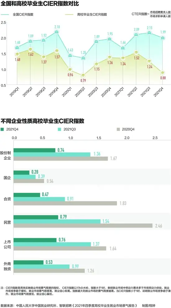 中国人民大学就业研究所所长曾湘泉介绍,“疫情反复与宏观经济下行交织在一起,对高校毕业生就业构成很大影响。”2021年四季度高校毕业生景气指数CIER降至0.88,2022年一季度更降至0.71,这是2020年疫情暴发以来的新低点。