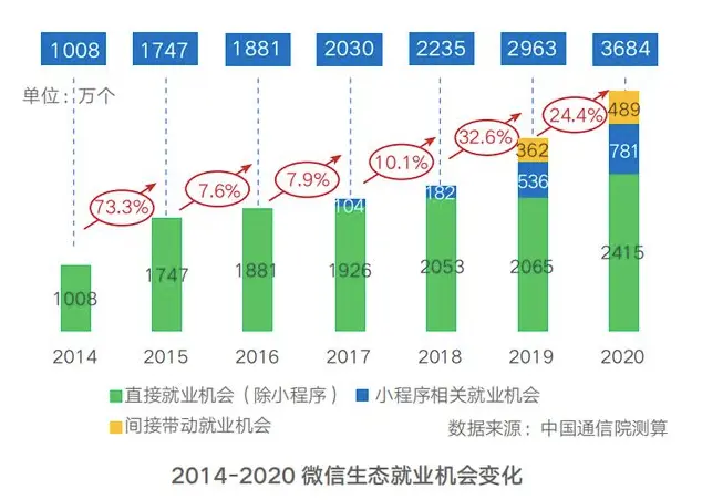 《2021数字化就业新职业新岗位研究报告》显示, 2020年微信生态蕴含的就业机会达3684万个。其中,微信小程序的开发、产品、运营等工作机会超过780万个,同比增长45.6%;小程序、企业微信、微信支付等服务商共带动290万就业机会。