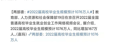 近日,国家发改委等八部门联合印发《关于深入实施创业带动就业示范行动力促高校毕业生创业就业的通知》提到2022届的毕业生预计会达到1076万人,突破千万大关,同比增加了167万人。同时,《通知》提出力争2022年为高校毕业生提供200万个高质量就业机会,为全国做好创业带动就业工作做示范。