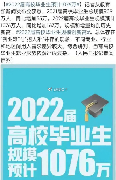 2022届高校毕业生的规模将达1076万人,创历史的首次破千万纪录。年年都喊”最难就业季“,这一次才是真正的史上”最难就业季“!