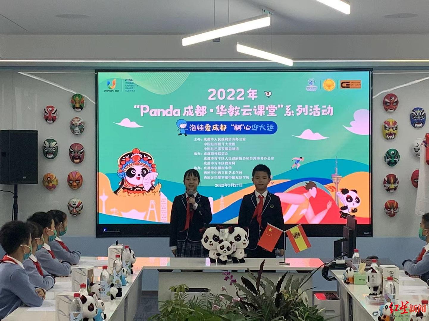 第31届世界大学生夏季运动会即将于6月26日在成都开幕,为抓住成都大运会举办契机,充分发挥好“Panda成都·华教云课堂”云端平台,通过云端连线,直播授课的新模式,让海内外华裔青少年更多地了解世界大学生夏季运动会成都筹备情况,激发海外华裔青少年对中华文化的热爱之情,激励成都学生争做成都城市形象的鲜活名片,3月27日,由成都市人民政府侨务办公室、中国驻西班牙大使馆和中国驻巴塞罗那总领馆主办,成都海外联谊会、青羊区人民政府侨台事务办公室和青羊区教育局承办,成都市泡桐树小学、西班牙中西文化艺术学校和西班牙巴塞罗那中加友好学校协办的2022年“Panda成都·华教云课堂”系列活动——泡娃爱成都“桐”心迎大运活动在青羊区举行。