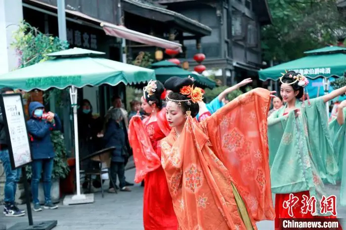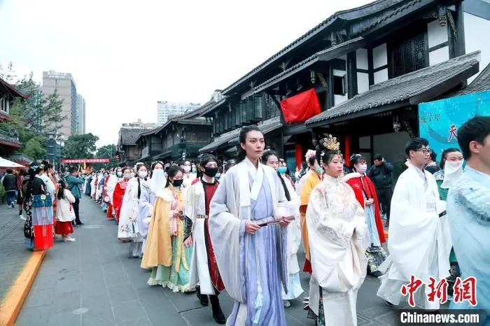 据悉,11月22日,2020“天府相邀 美丽之约”汉服文化节在四川省成都市青羊区文殊坊拉开序幕。为展示身为华夏儿女的美好风貌,众多来自各地的国风达人和热爱传统文化的年轻人积极响应,自发组织了“雅风、花开、望雪、拜月”4支分队,分别从望江楼公园、天府广场、宽窄巷子、春熙路4个地标集结出发,以汉服出行这一身体力行的方式,展现华裳之美。