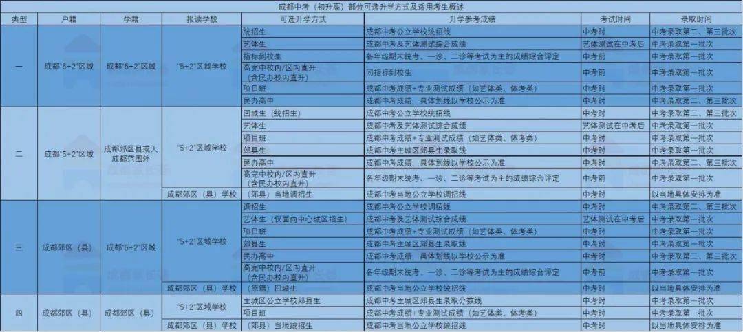 关于中考身份,我们在前两天的《成都中考录取的8种方式,你知道几种?》 文章中也跟大家强调过,根据学生户籍和学籍的不同,大概分为统招生、调招生、郊县生和回城生。