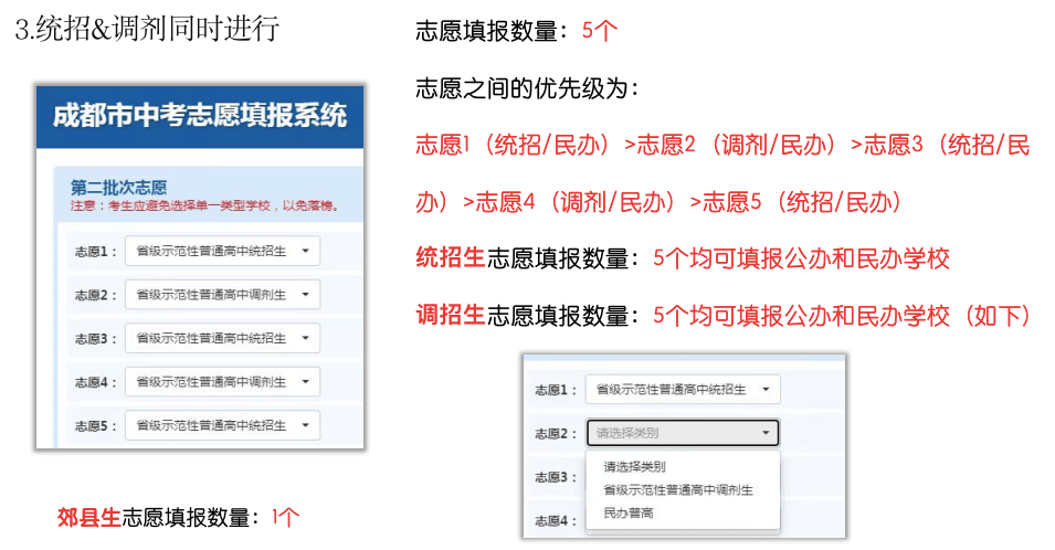 简单来说,统招生可以填5个志愿,其中1、3、5志愿可以填统招(公办)或民办志愿,2、4志愿可以填报调剂(公办)或民办志愿。
