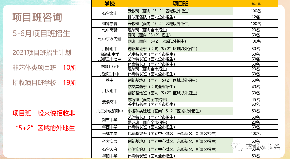 简单来说,项目班就是部分高中学校,面向成都市或“5+2”区以外等不同区域,招收的具有某方面特长学生的特殊班型。主要包括成绩类、艺术类、体育类、科创类、航空类等招生类别,统称为“项目班”。