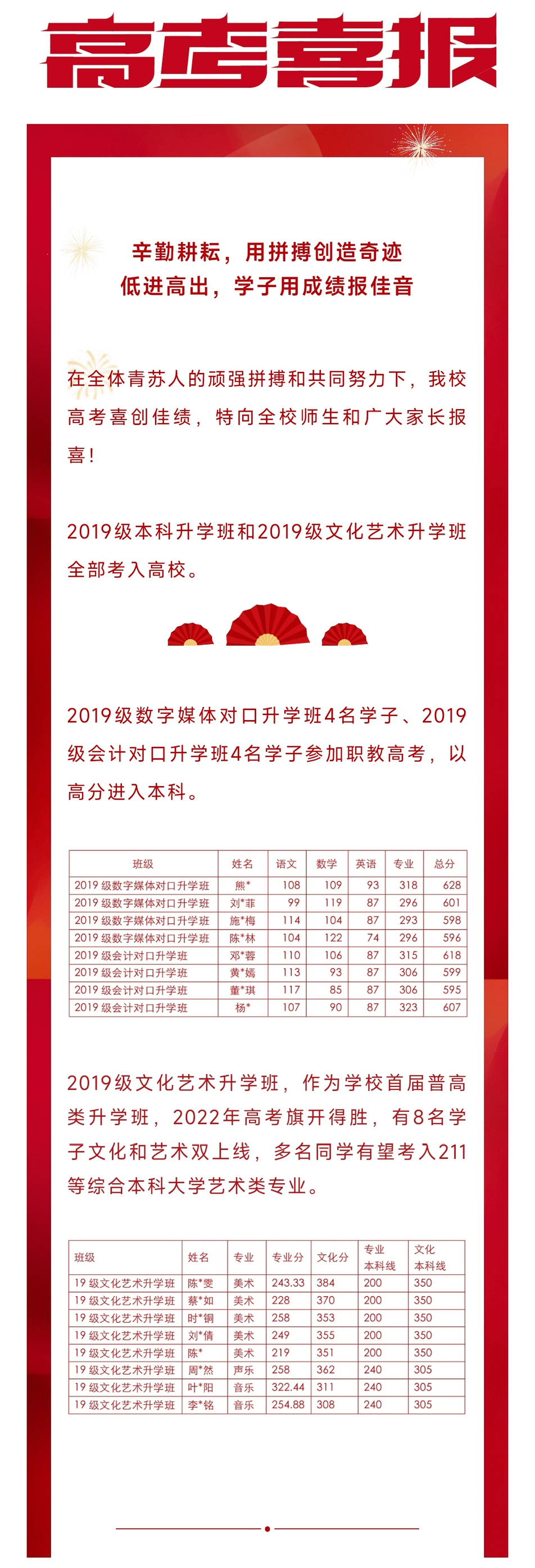 2019级本科升学班和2019级文化艺术升学班全部考入高校;2019级数字媒体对口升学班4名学子、2019级会计对口升学班4名学子参加职教高考,以高分进入本科;2019级文化艺术升学班,作为学校首届普高类升学班,2022年高考旗开得胜,有8名学子文化和艺术双上线,多名同学有望考入211等综合本科大学艺术类专业。