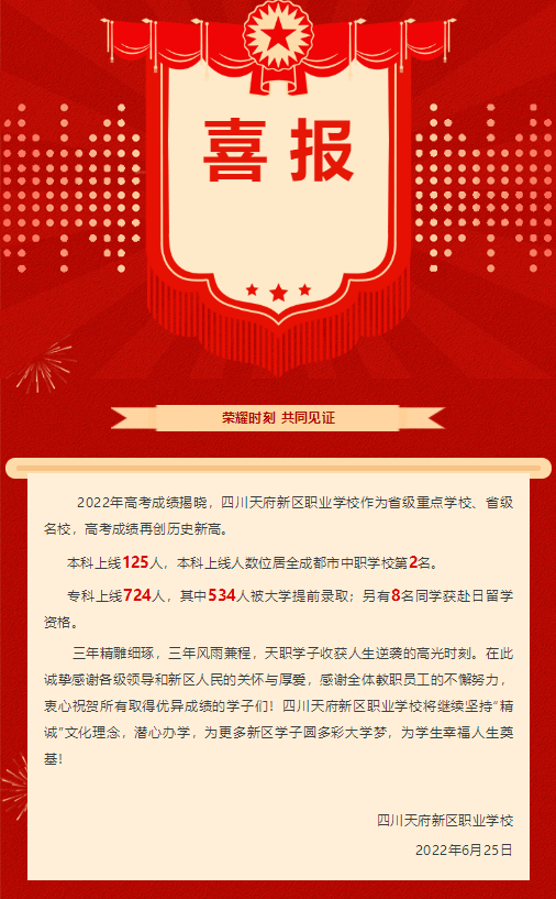 2022年高考成绩揭晓,四川天府新区职业学校作为省级重点学校、省级名校,高考成绩再创历史新高。