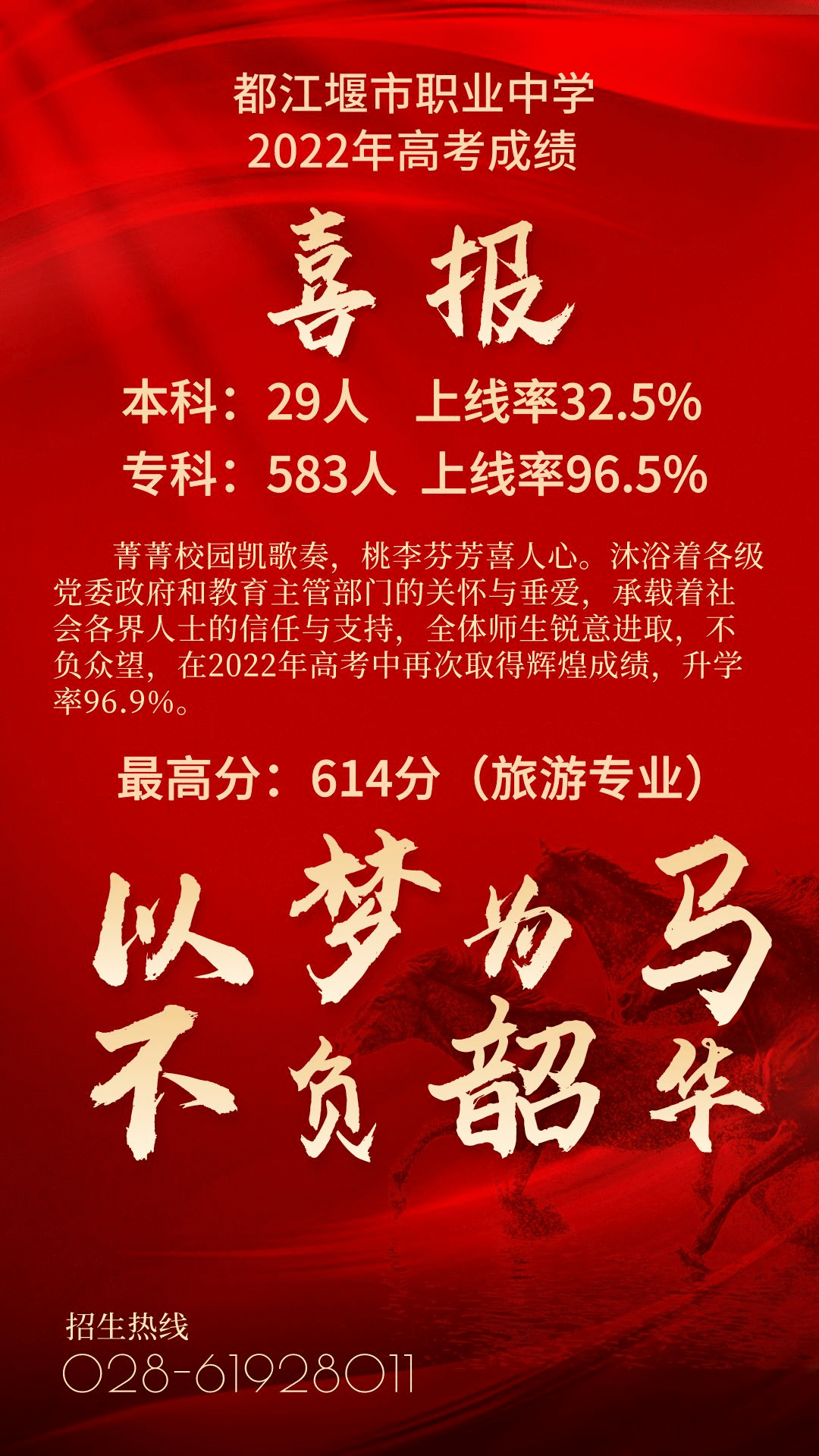 都江堰市职业中学2022年对口高考本科上线29人,上线率32.5%;专科上线583人,上线率96.5%。学校在2022年高考中再次取得辉煌,升学率达96.9%。