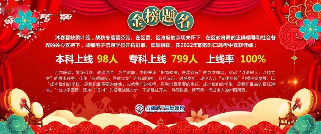 成都电子信息学校开拓进取、砥砺耕耘,在2022年职教对口高考中喜获佳绩:本科上线98人,专科上线799人,上线率100%。