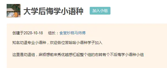 在“大学后悔学小语种”的豆瓣小组中,北外上外ers和双非ers找到了共鸣,他们在这片小小的赛博空间实现大融合,高校间的拉踩鄙视,可以一笑泯恩仇,前浪整齐划一地劝退后浪。