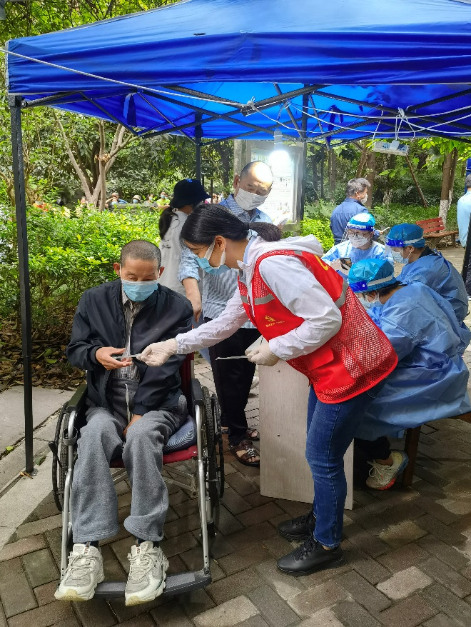 成都医学校以及附属医院的党员同志响应号召,主动报名。在成都清波社区、马超社区、兴乐社区等地,积极参与核酸检测采服务,并开展引导居民排队检测,帮助老年居民申领健康码等相关工作。