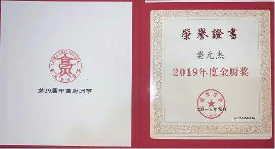 从厨30多年来,樊元杰勤勤恳恳,勇于创新,2017年担任兴文县烹饪协会会长。自担任会长以来,带领协会完成乌骨鸡宴、苗家宴的制作传承。2018获得第八届全国烹饪技能竞赛银奖、2019年获得中国烹饪协会颁发的中国注册烹饪大师证、2019年9月获得中国烹饪协会年度金厨奖。