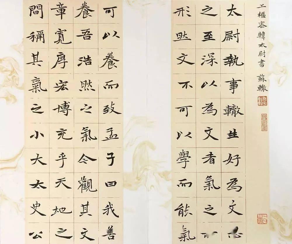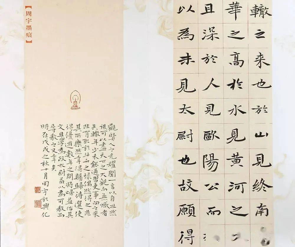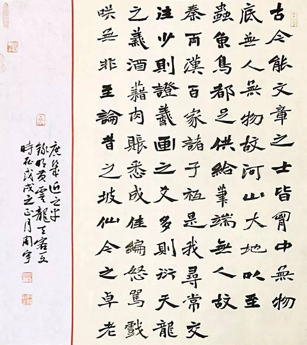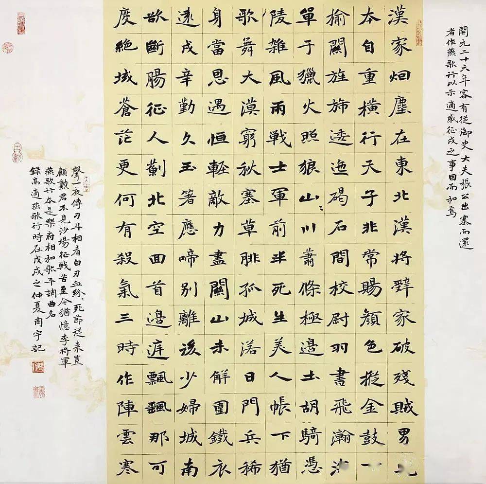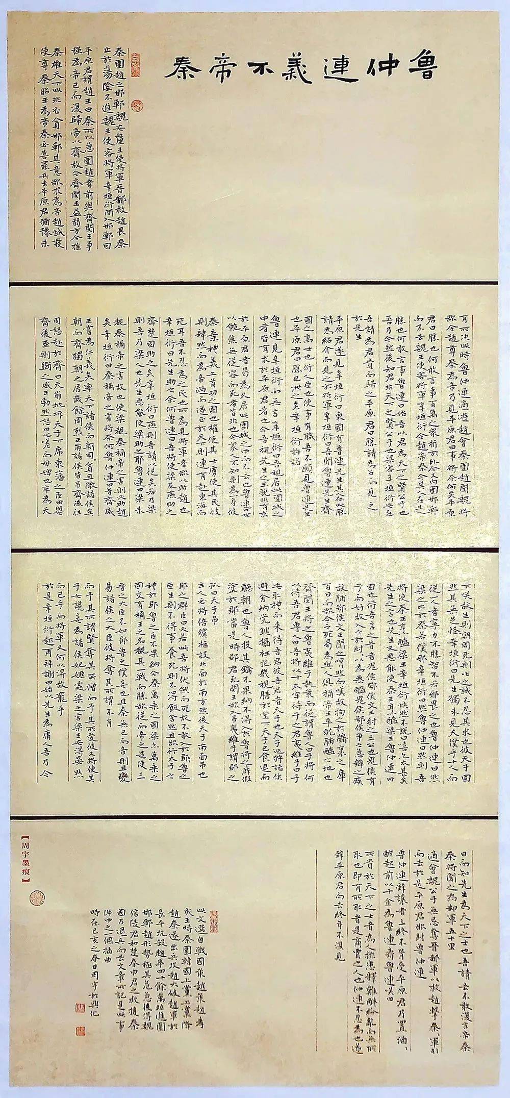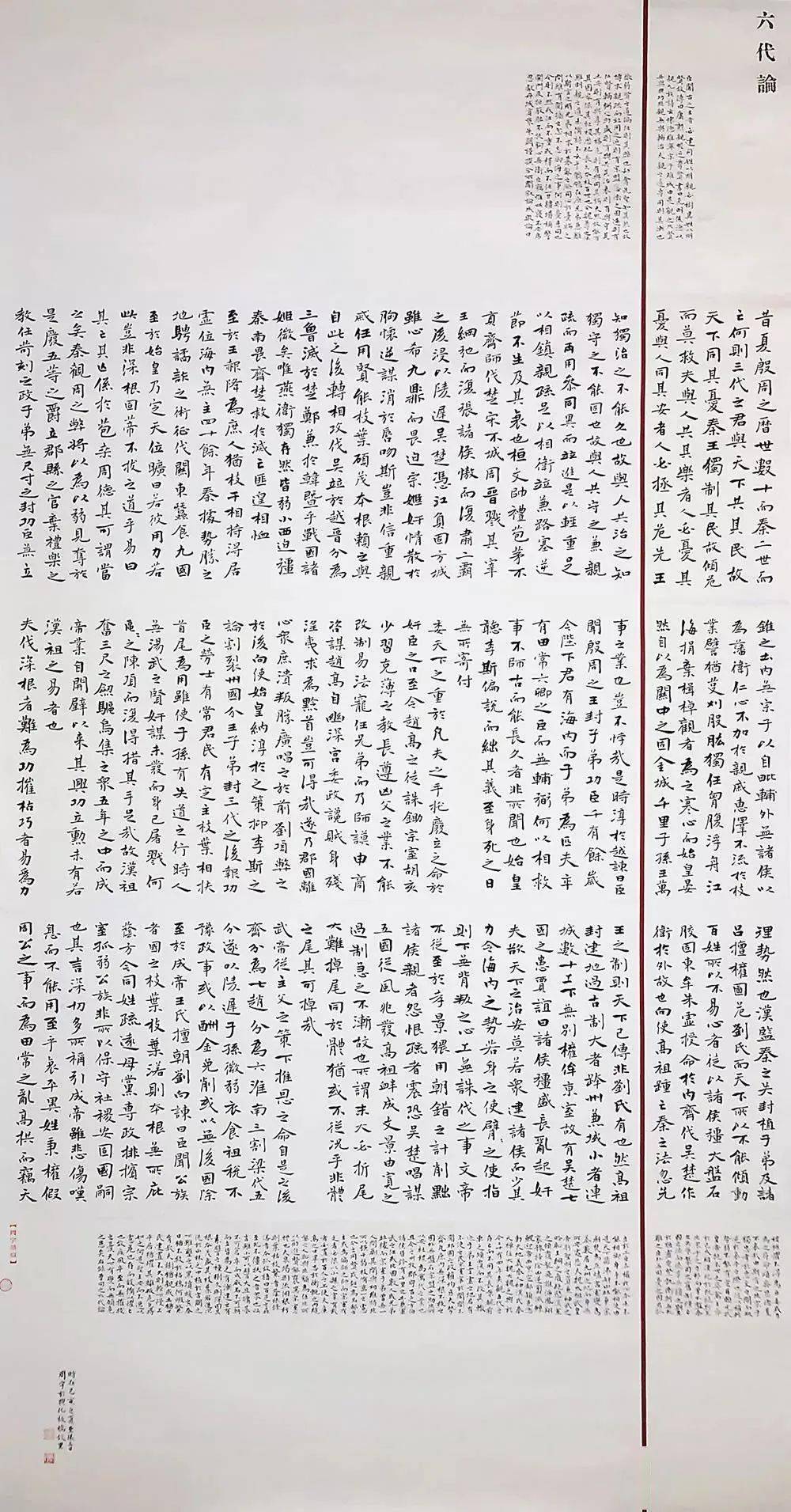 此次入展十二届国展的作品内容选自《昭明文选》曹元首之《六代论》一文,全文近2300字。首先在纸张颜色的选择上我的主张是整体格调清新淡雅,整八尺通篇都是接近于白的浅米黄色,只在作品右侧镶以细细的红色钜条加以点缀。在书写作品的形式上,因绝大多数中楷作品都会打格子书写,所以我想有所创新突破,正文4公分中楷书写的主体部分选用了行书手卷有行无列的表现方式,首尾分别用1.5公分小楷书写,并考虑到适当留白,使作品构图上连贯透气,既有整体性,又有层次感。这种形式大大增加了书写难度,须加强字与字之间的变化及联系,在魏碑古拙的基础之上,用笔适当借鉴了行书笔意,使作品气息清朗,刚而不硬,静而不软,呈现出崭新的面貌。