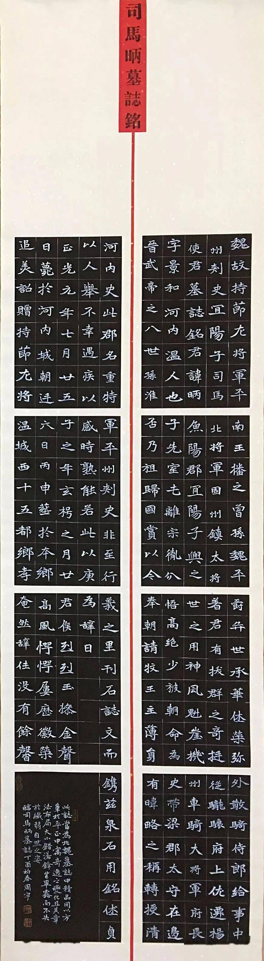 2015年10月底,有幸结识李玉江、杨玉剑两位老师,在二位老师的指点下,从北碑《司马昞墓志》入手,研习楷法,从笔法到字形、结构,再到章法、形式、构图,从临到创,其间结合《苏孝慈墓志》、《李璧墓志》、《乐安王墓志》、《大字阴符经》、《雁塔圣教序》、王羲之手札等碑帖,兼收并蓄,汲取养分,让楷书厚重而不失灵动。