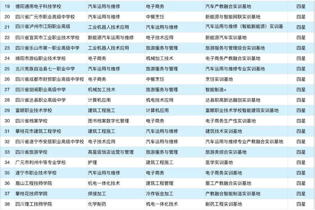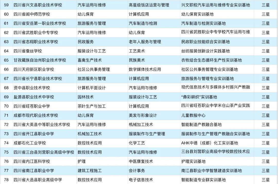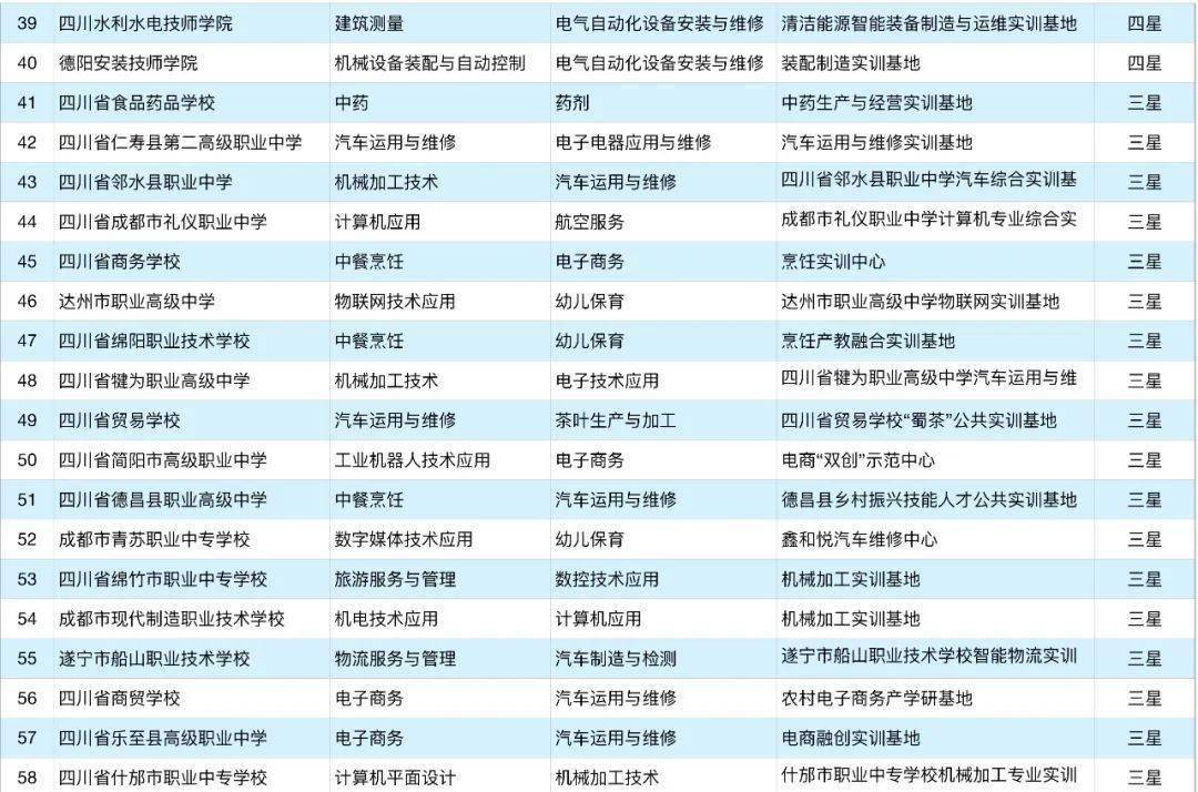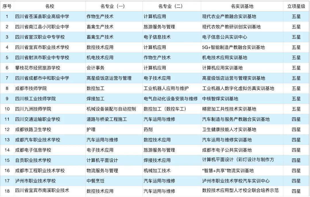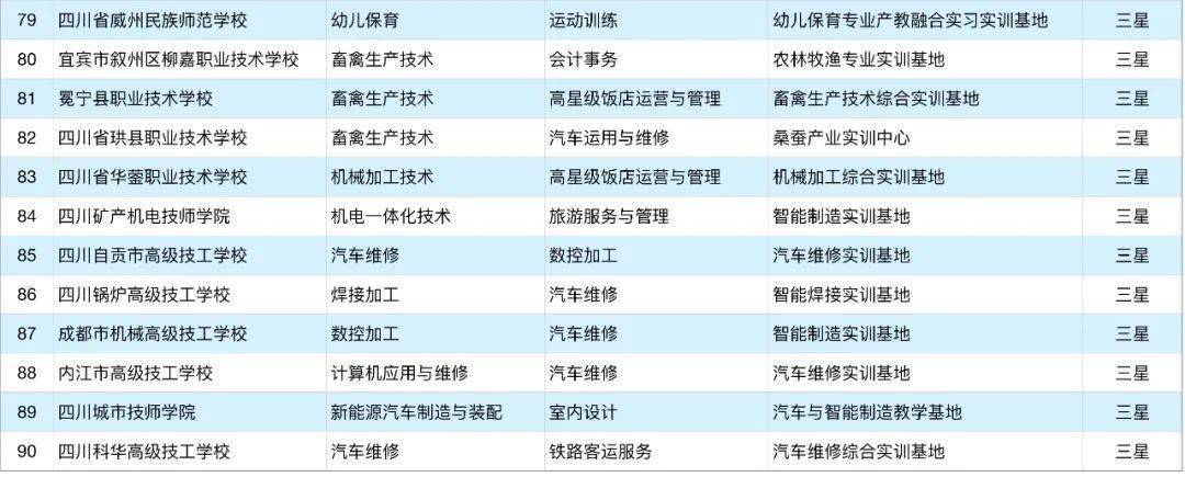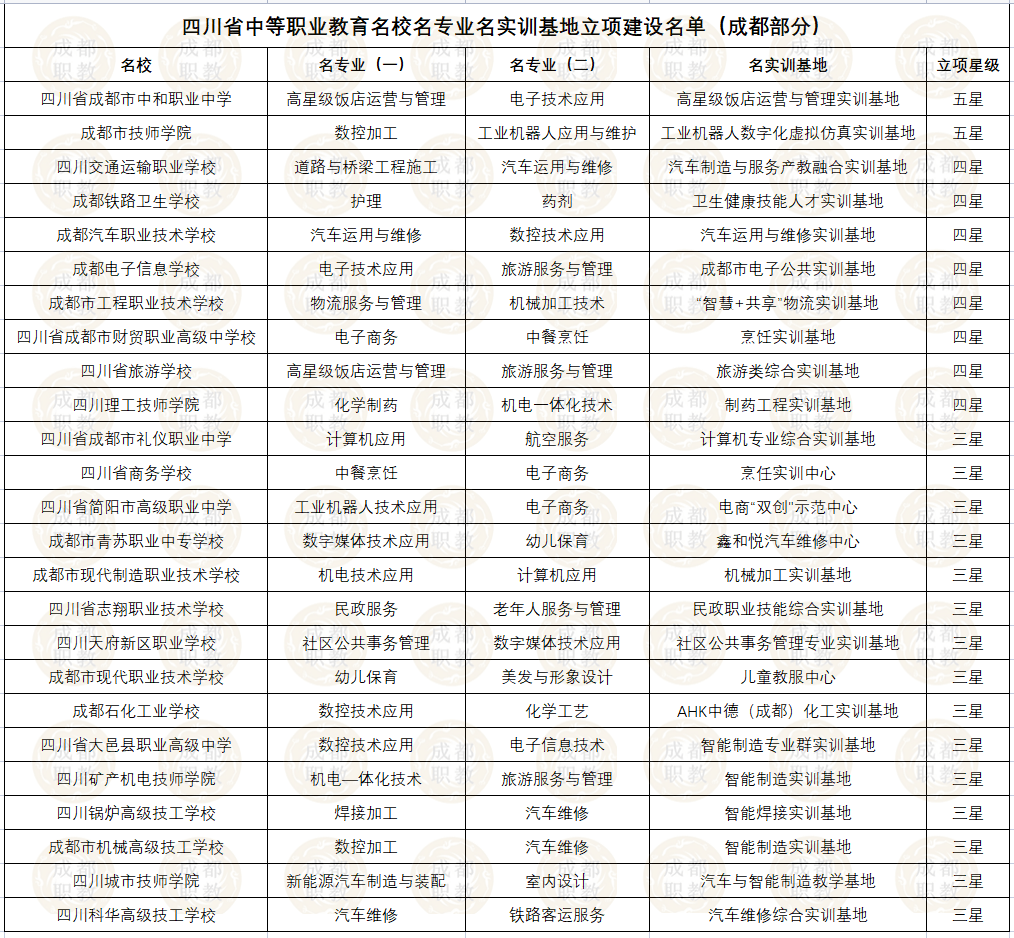 此次《通知》公布了我省首批立项建设的90所中等职业教育名学校、180个名专业和90个名实训基地名单。25所在蓉的中等职业教育学校入选,其中四川省成都市中和职业中学和成都市技师学校更是成功立项五星级建设项目。