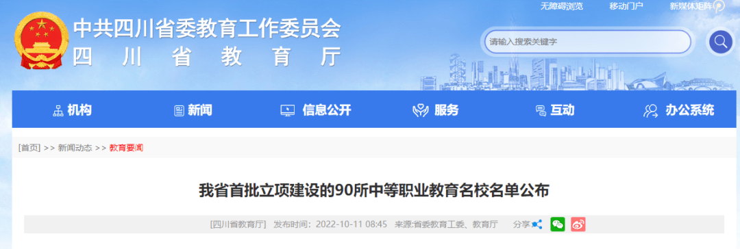 近日,教育厅、人力资源社会保障厅、财政厅印发《关于公布四川省中等职业教育名校名专业名实训基地建设工程立项建设名单和开展项目建设工作的通知》(以下简称《通知》。
