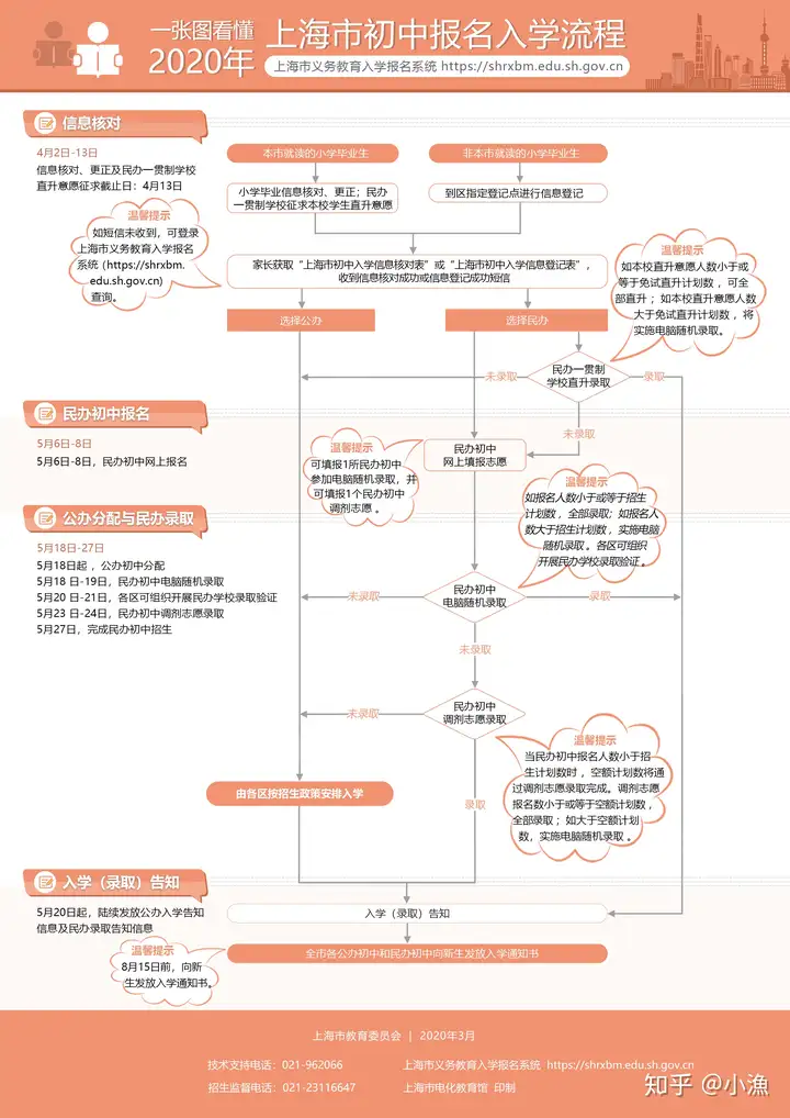 1.小学毕业信息核对。4月2日-4月13日,各区有序组织本市户籍和符合条件的非本市户籍小学五年级学生家长对“上海市义务教育入学报名系统”中的户籍地址、居住地址等入学关键信息进行核对,并填写监护人手机号码(作为接收初中入学信息的联系方式),如发现有关信息与实际情况不符的,家长应及时凭有效证件到学生就读小学进行更正。同时,各区组织民办一贯制学校征求本校学生直升意愿。4月13日为本市小学五年级学生初中入学关键信息核对、更正及民办一贯制学校直升意愿征求截止日。