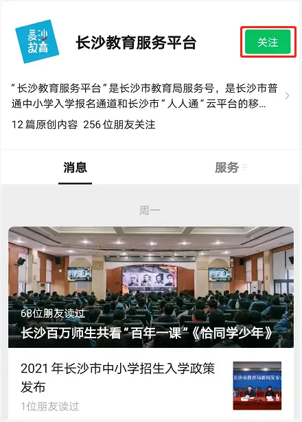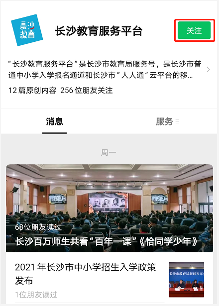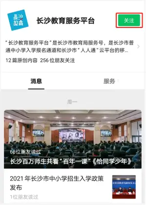 微信搜索并关注“长沙教育服务平台”公众号,入学前请勿解除公众号关注,以免错过学校相关通知。