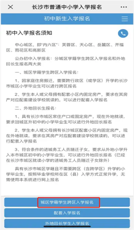 3. 了解初中入学报名须知,选择“城区学籍学生跨区入学报名”