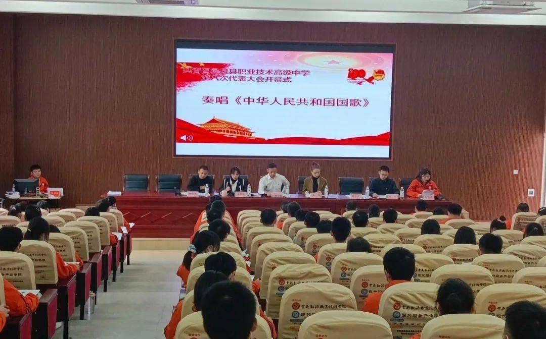共青团彝良县职业技术高级中学第八次会议的团员代表们身穿校服,胸带团徽,全体起立,奏唱国歌,大会会场洋溢着青春气息。共青团彝良县职业技术高级中学第八次代表大会正式拉开帷幕!